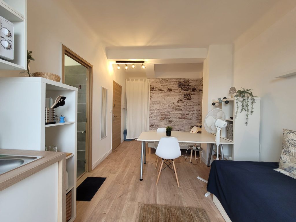 Cette chambre type studio de 20 m2 se situe au deuxième étage d’un immeuble en colocation. Elle possède une salle de douche privée. Dans la chambre, un coin bureau / table à manger, petite cuisine avec micro-ondes grill, plaque de cuisson portable et frigo. Elle a tous les ustensiles de cuisine de base: poêles, casseroles, couverts, assiettes…