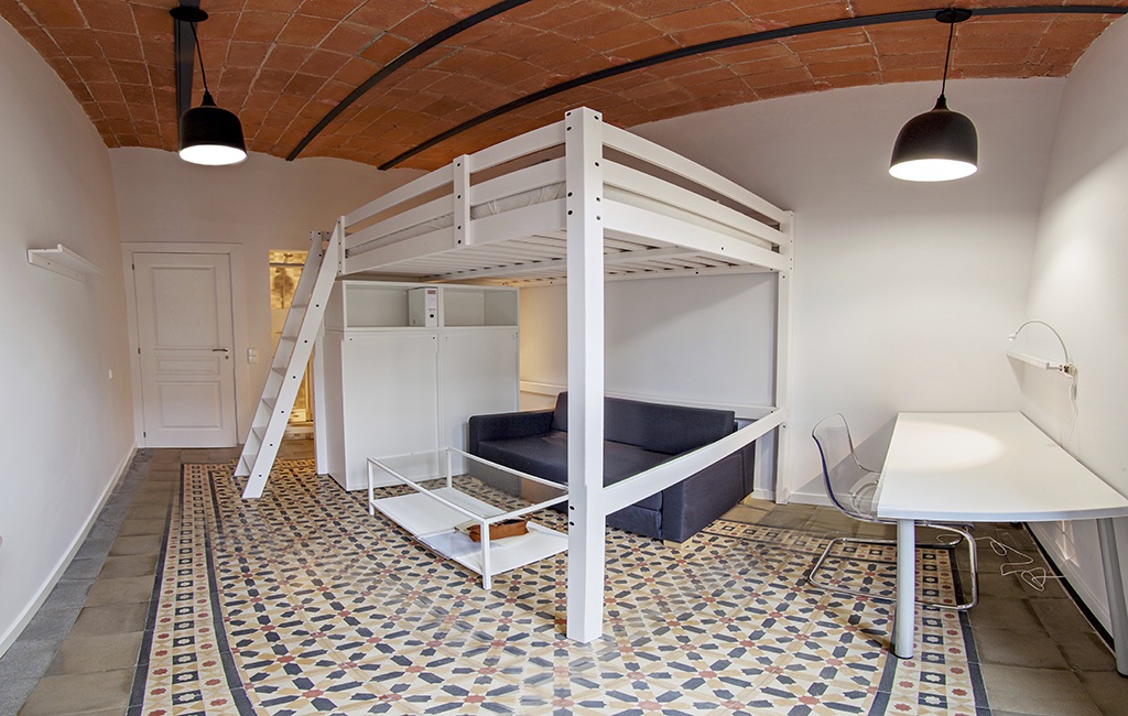 Cette chambre de 15 m2 avec 3m2 de lit double en hauteur est parfaite pour les étudiants en Erasmus ou stage à Barcelone. Lumineuse, avec une porte vitrée qui donne à une véranda sur la cour. La chambre dispose d’un canapé avec une grande table basse, un bureau et chaise de bureau et une grande armoire.
