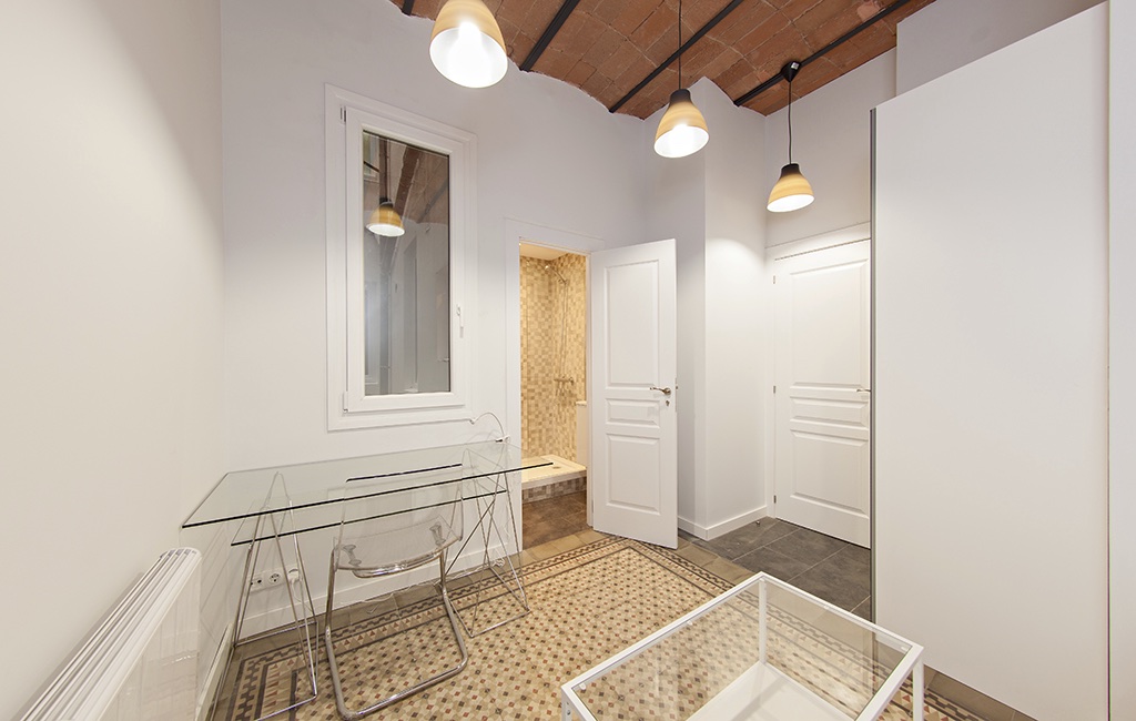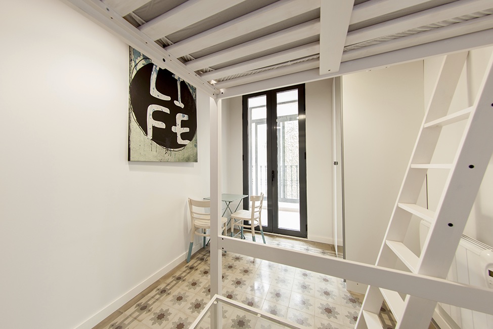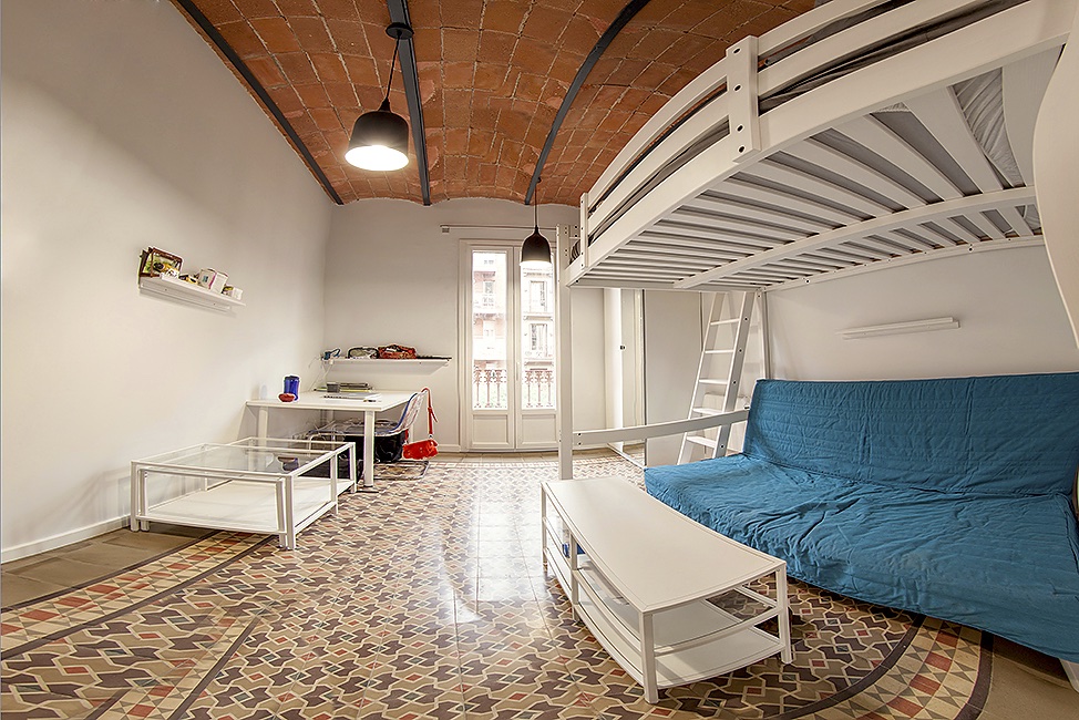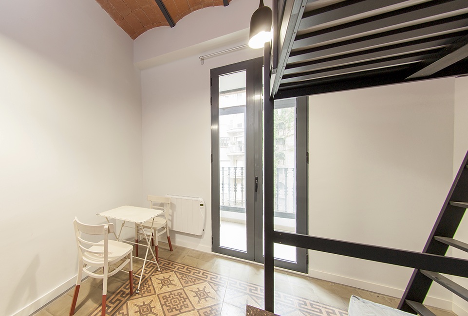 Cette chambre de 15 m2 avec 3m2 de lit double en hauteur est parfaite pour les étudiants en Erasmus ou stage à Barcelone. Lumineuse, avec une porte vitrée qui donne à un balcon sur l’Eixemple. La chambre dispose d’un canapé-lit avec deux grandes tables basses, un bureau et chaise de bureau et une grande armoire.