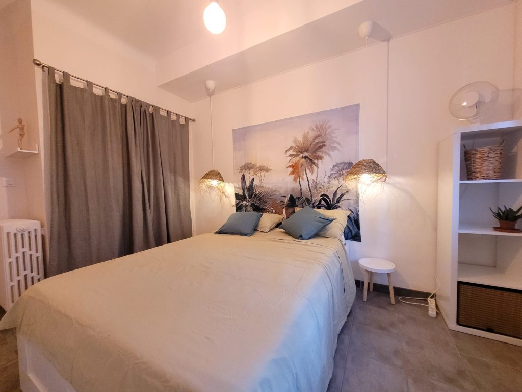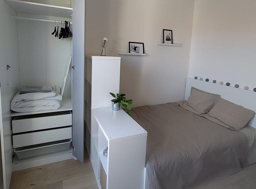 Cette chambre lumineuse a été décorée avec des meubles en bois et noir; un des murs peint en vert célandon et les luminaires en jute apportent un côté très naturel à cette pièce. Elle comprend tout ce qui est nécessaire à la vie d’un étudiant ou d’un travailleur en home-office: 1 lit double de 140×200 avec un énorme coffre de rangement dessous, 1 table de nuit, 1 petit bureau avec une chaise confortable…