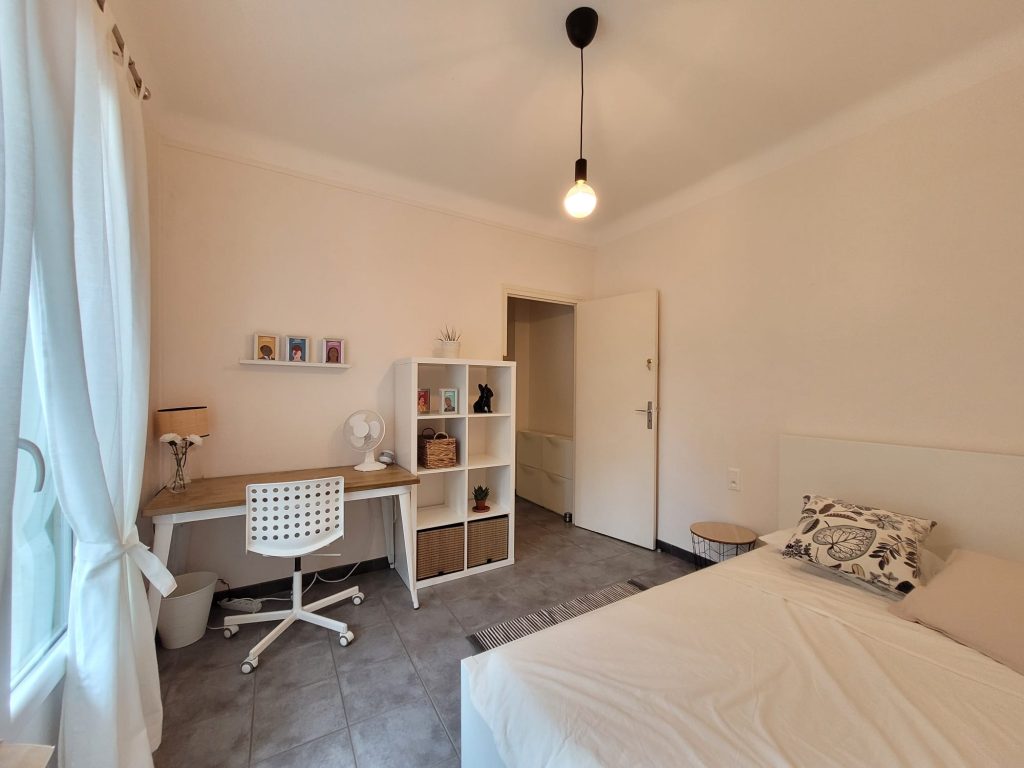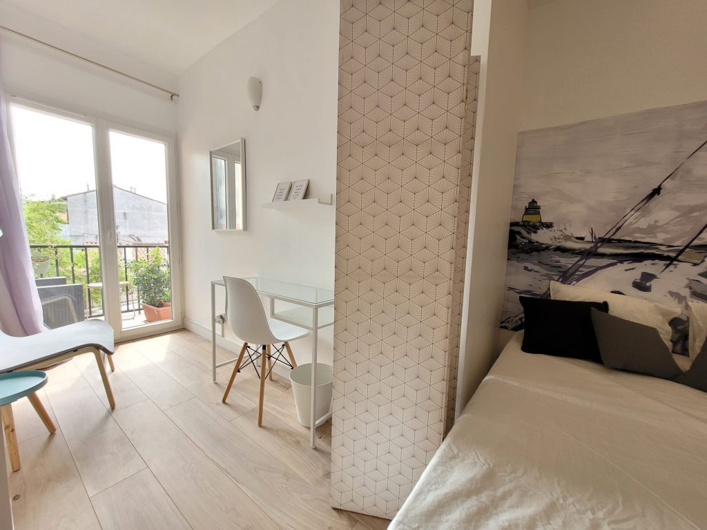 Cette chambre de 11 m2 avec lit simple convertible en lit double est parfaite pour les étudiants en Erasmus ou stage à Barcelone. Chambre pensée pour optimiser l’espace au maximum, avec fenêtre sur la cour intérieure. La chambre dispose d’un bureau avec chaise de bureau, une grande armoire et accès à sa salle de douche privée par la chambre.