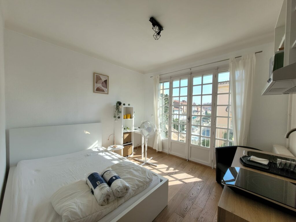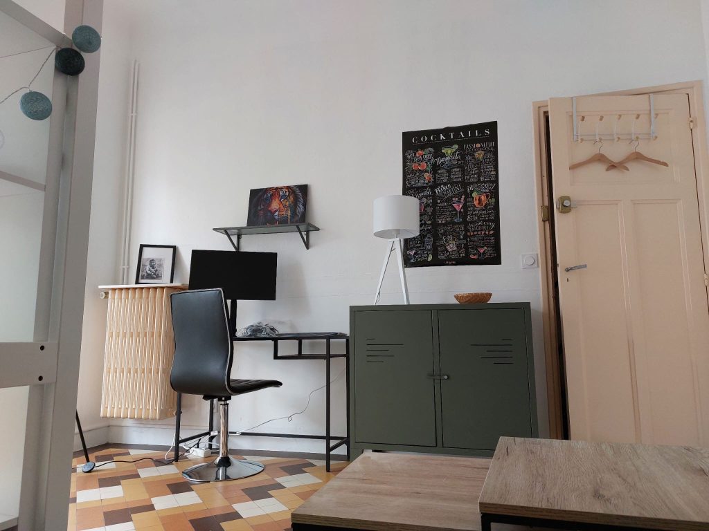 Cette chambre type studio de 15 m2 se situe au premier étage d’un immeuble en colocation. Elle possède une salle de douche privée. Dans la chambre, un coin bureau / table à manger, petite cuisine avec micro-ondes grill, plaque de cuisson portable et frigo. Elle a tous les ustensiles de cuisine de base: poêles, casseroles, couverts, assiettes…