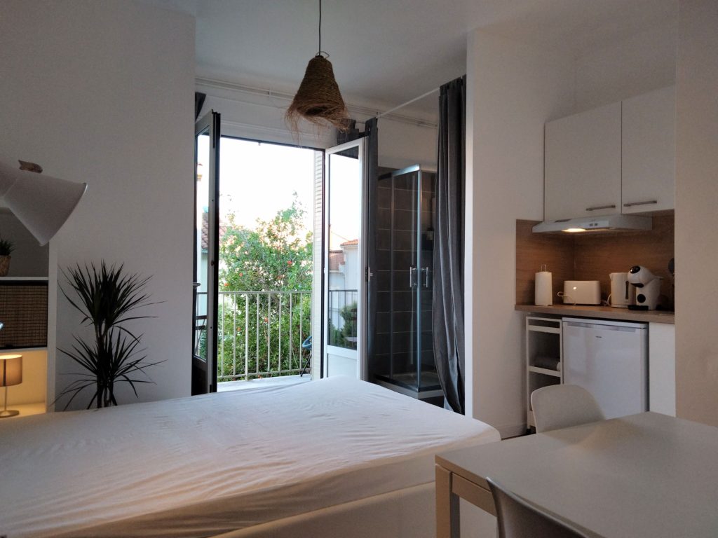 Cette chambre type studio de 18 m2 se situe au premier étage d’un immeuble en colocation. Elle possède une salle de douche privée. Dans la chambre, un coin bureau / table à manger, petite cuisine avec micro-ondes grill, plaque de cuisson portable et frigo. Elle a tous les ustensiles de cuisine de base: poêles, casseroles, couverts, assiettes…
