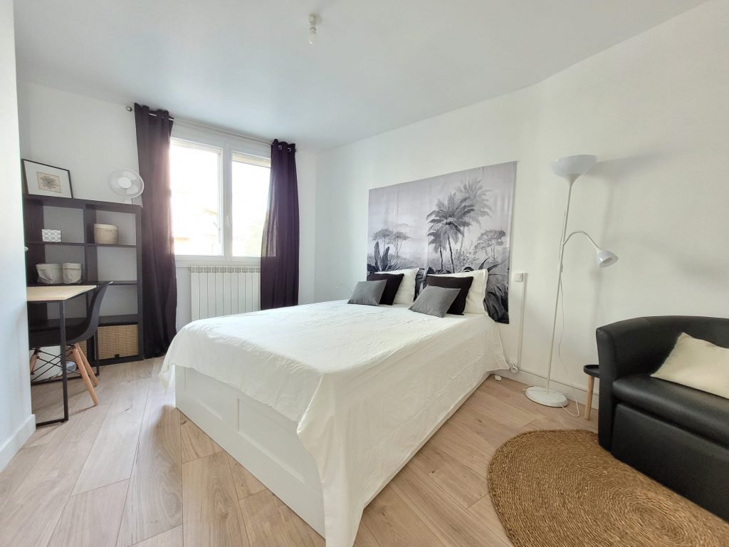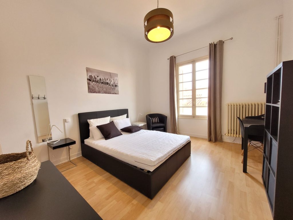 Chambre très lumineuse de 17 m2 avec lit double, bureau et coin lecture. Elle possède de nombreux rangements et une salle de douche privée avec lavabo. Chambre équipée avec toutes les fournitures basiques pour un séjour confortable.