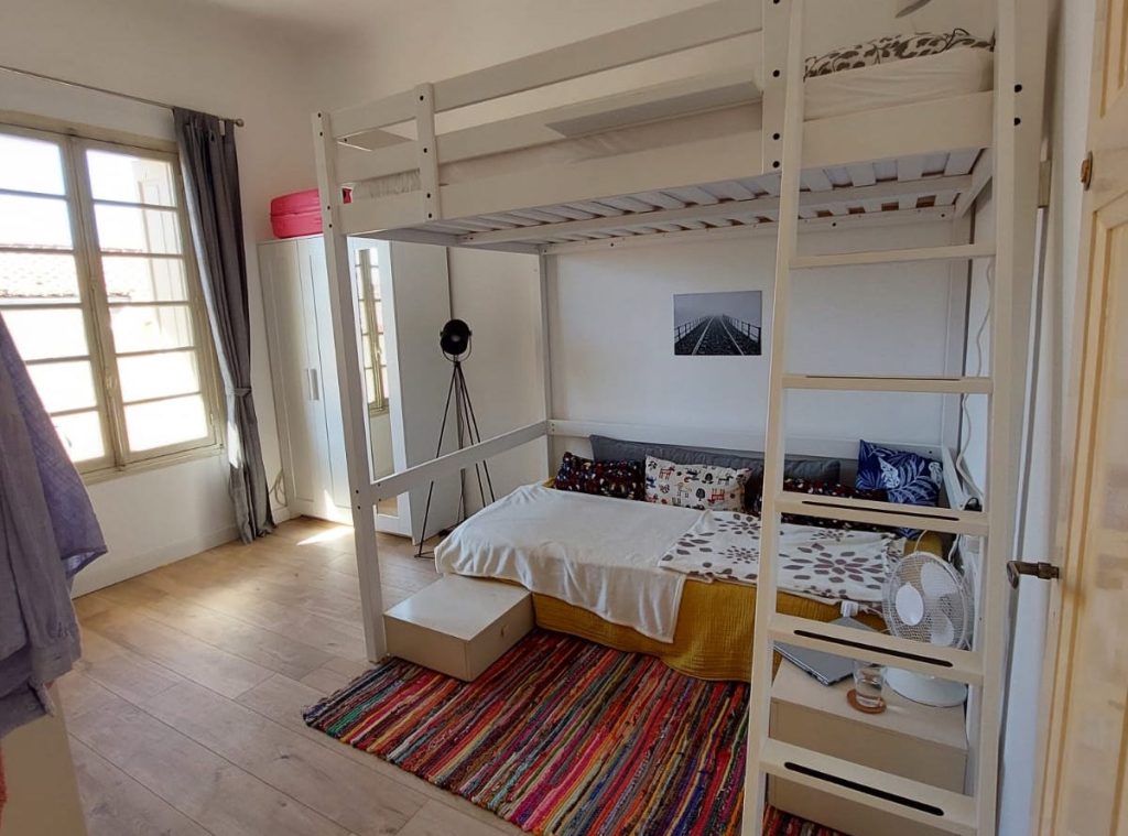 Cette chambre très lumineuse et moderne de 12 m2 contient un lit en mezzanine et partage une salle de bain avec une autre chambre. Elle est composée d’un canapé, d’un bureau, d’une armoire, une étagère et une commode.