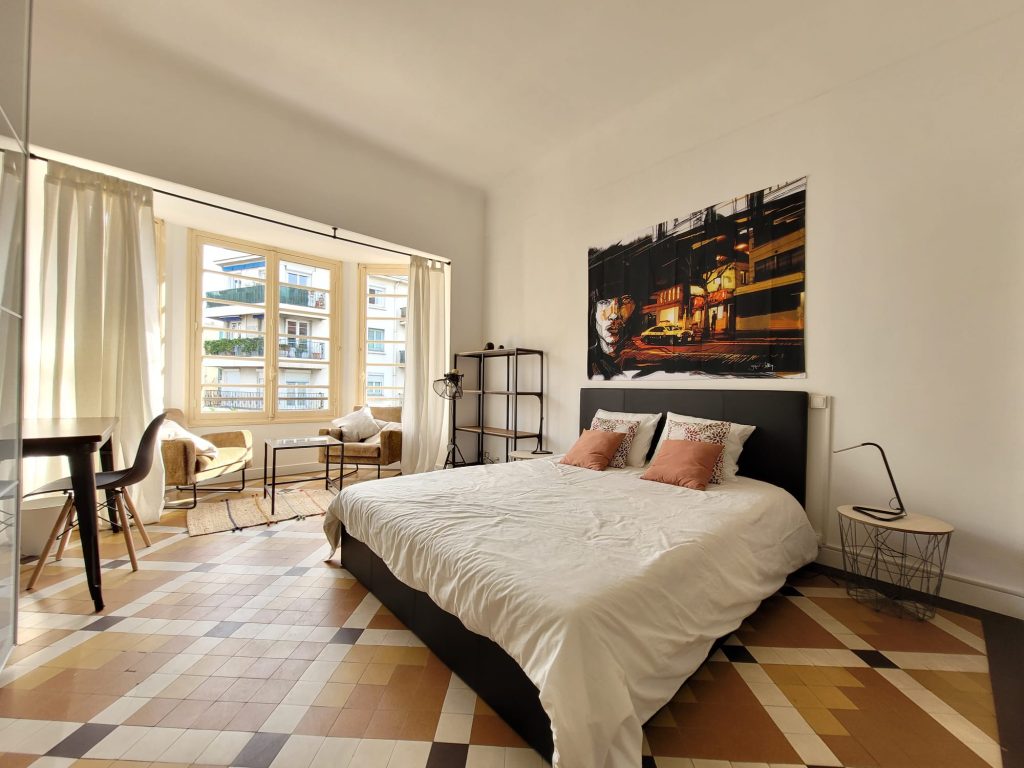 Cette chambre de 15 m2 avec 3m2 de lit double en hauteur est parfaite pour les étudiants en Erasmus ou stage à Barcelone. Lumineuse, avec une porte vitrée qui donne à un balcon sur l’Eixemple. La chambre dispose d’un canapé-lit avec deux grandes tables basses, un bureau et chaise de bureau et une grande armoire.
