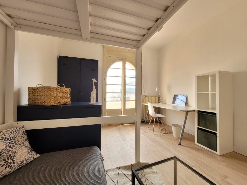 Cette chambre de 15 m2 avec 3m2 de lit double en hauteur est parfaite pour les étudiants en Erasmus ou stage à Barcelone. Lumineuse, avec une porte vitrée qui donne à une véranda sur la cour. La chambre dispose d’un canapé avec une grande table basse, un bureau et chaise de bureau et une grande armoire.